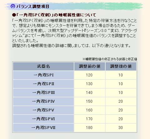 一角双SPの睡眠属性値を修正するという。